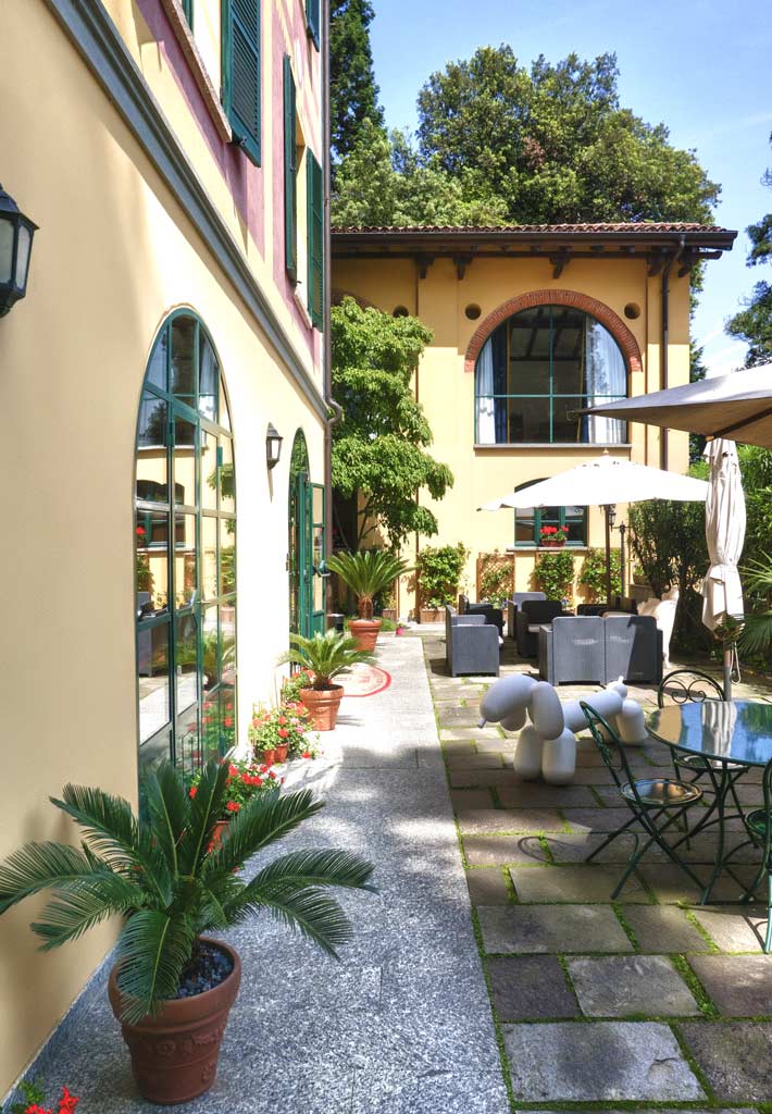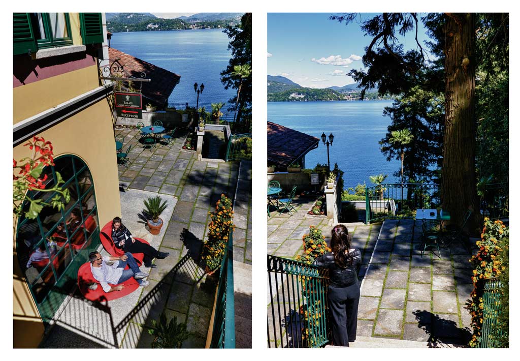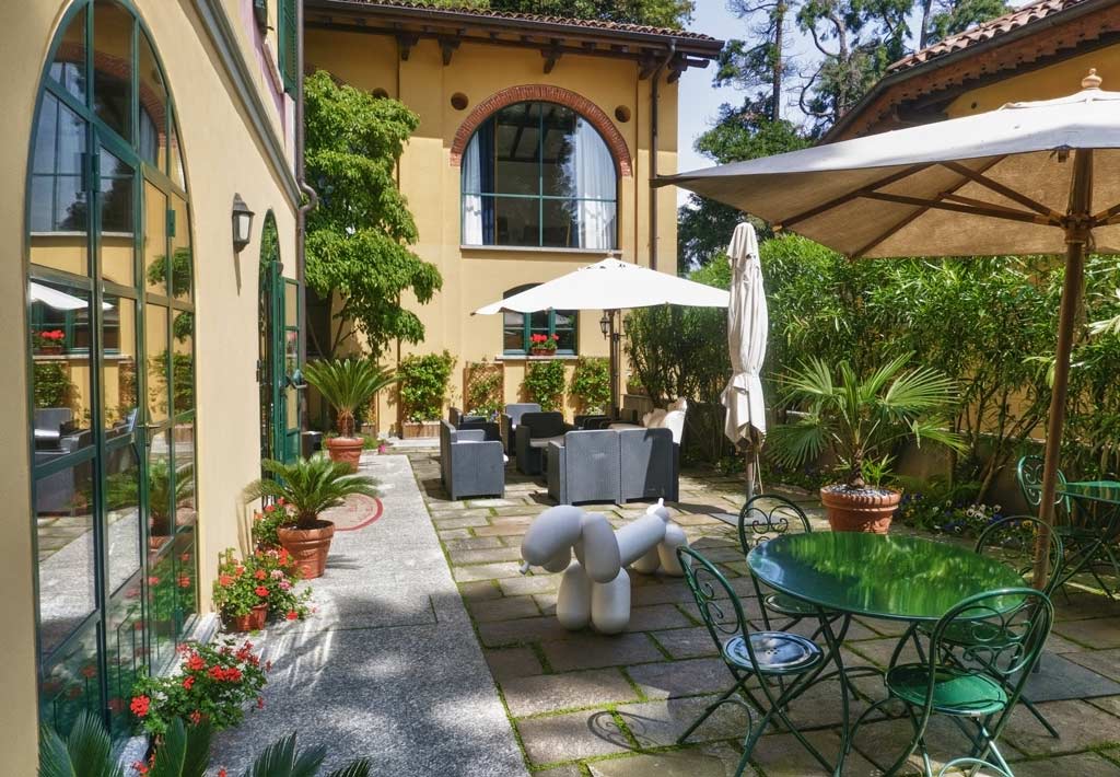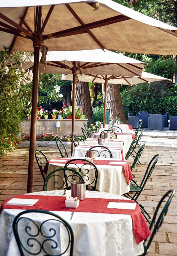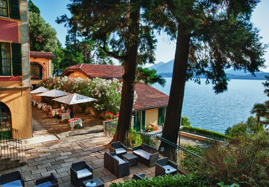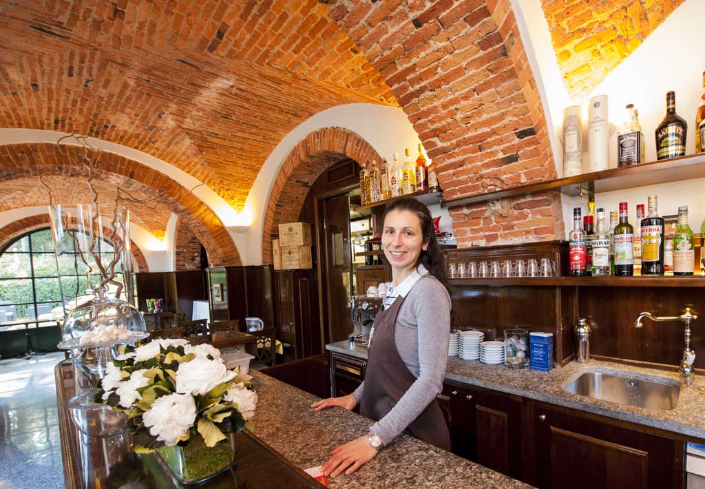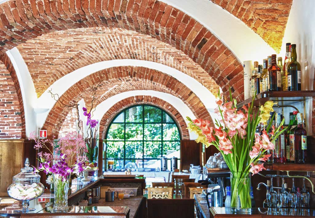 Servizio bar nella sala Stendhal, creata dal restauro di una vecchia stalla con volte in mattone a vista, oppure all’esterno sulla terrazza delle Cycas, all’ombra di una vecchia sequoia vista lago.